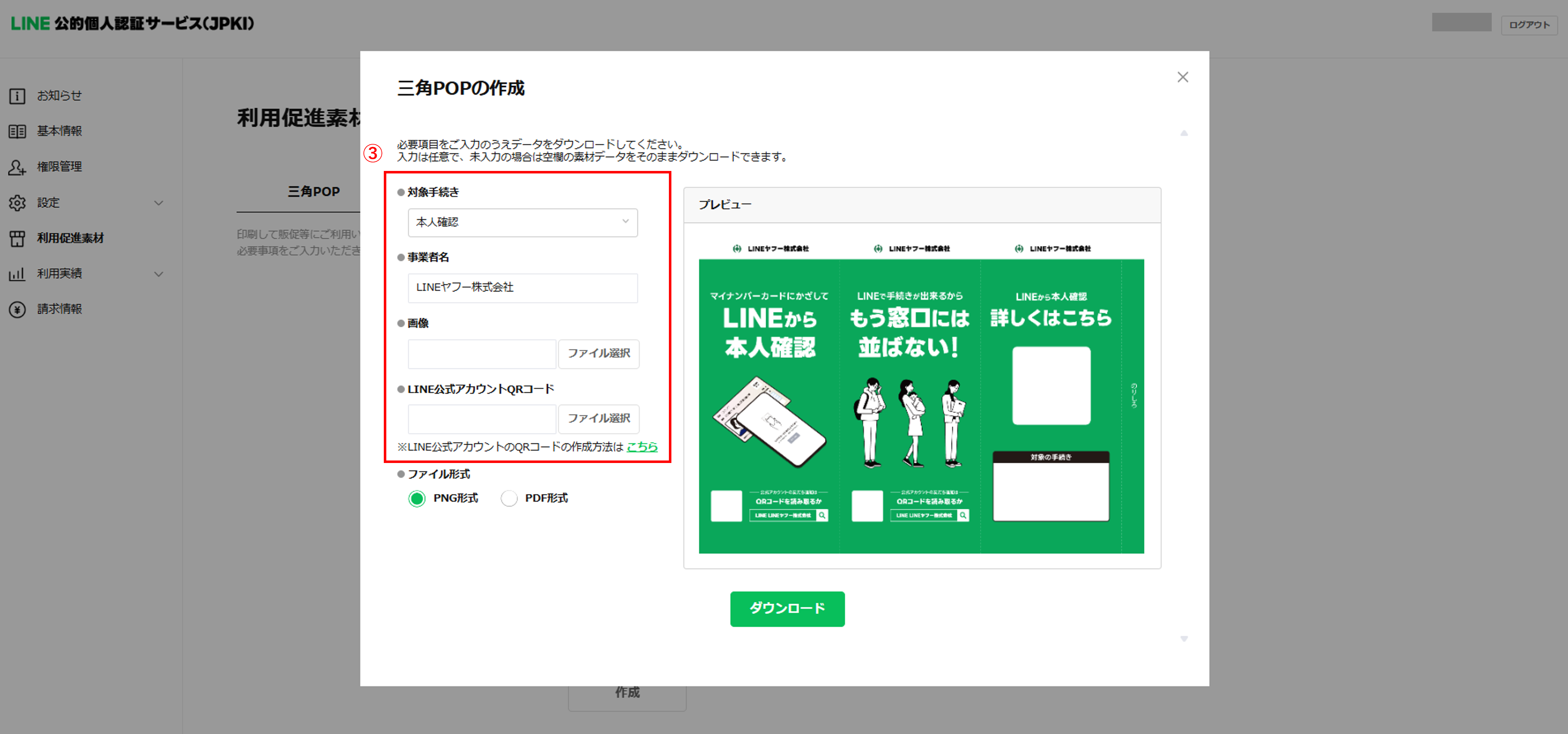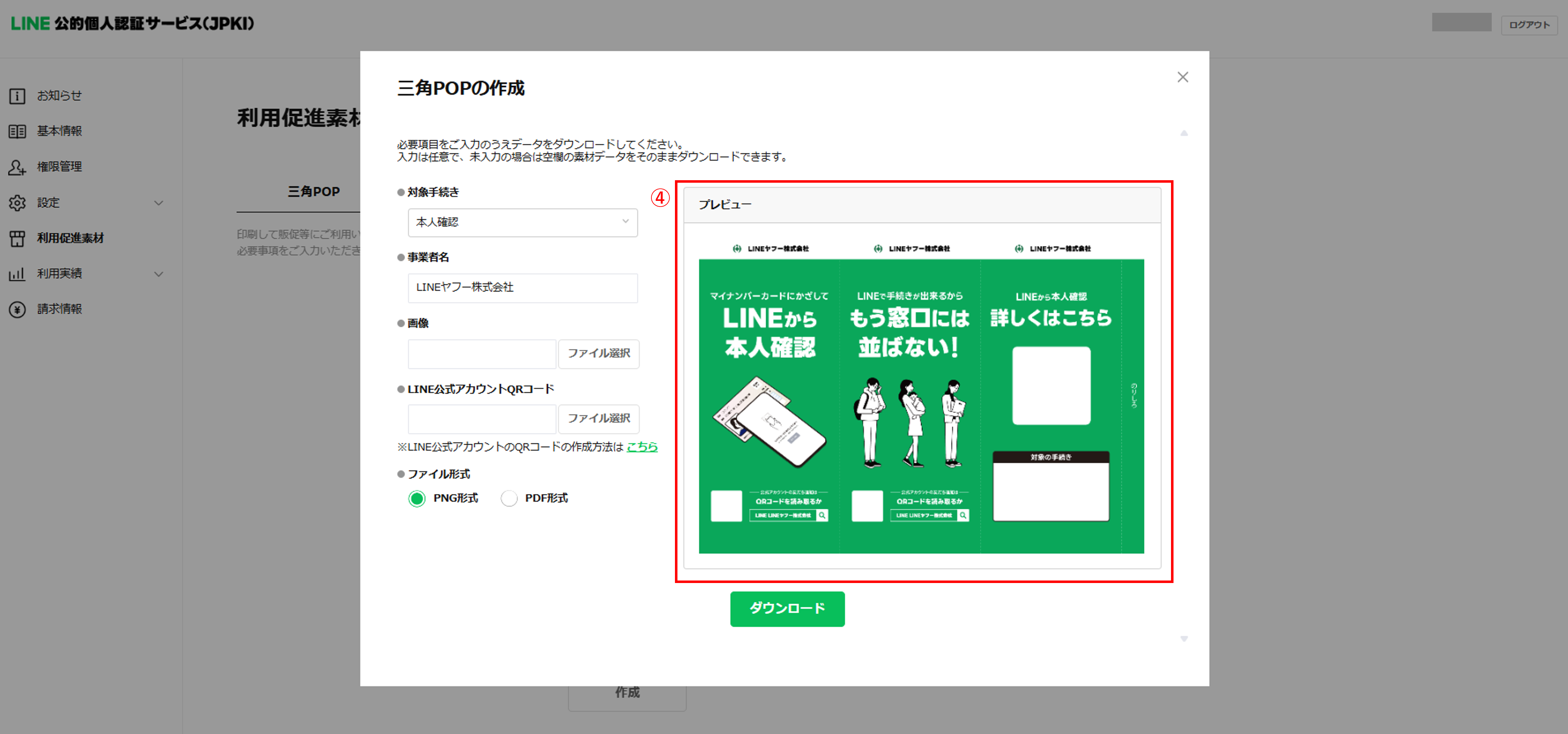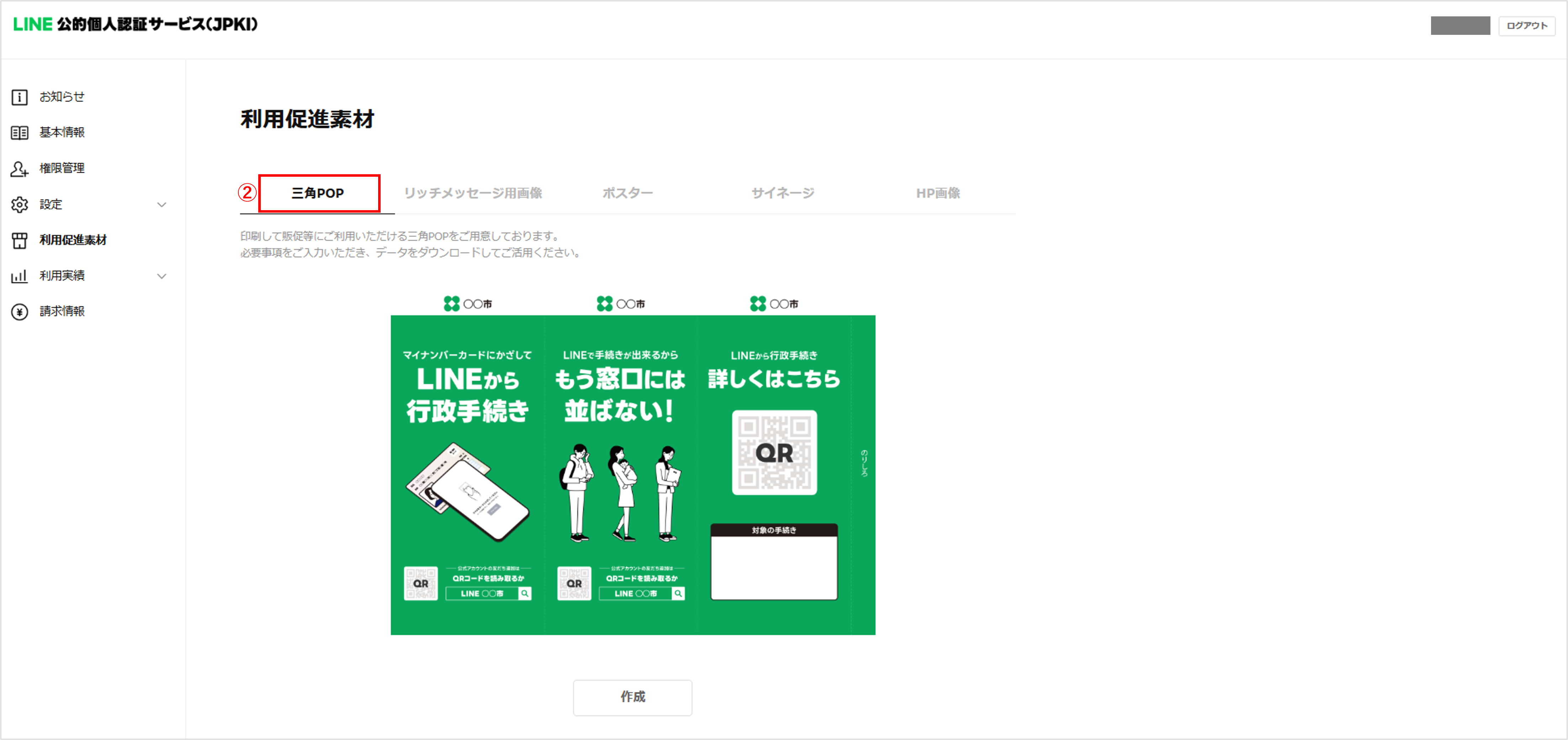 加盟店管理画面では、JPKI の周知・利用促進にご活用いただける各種販促素材を無料で作成できます。