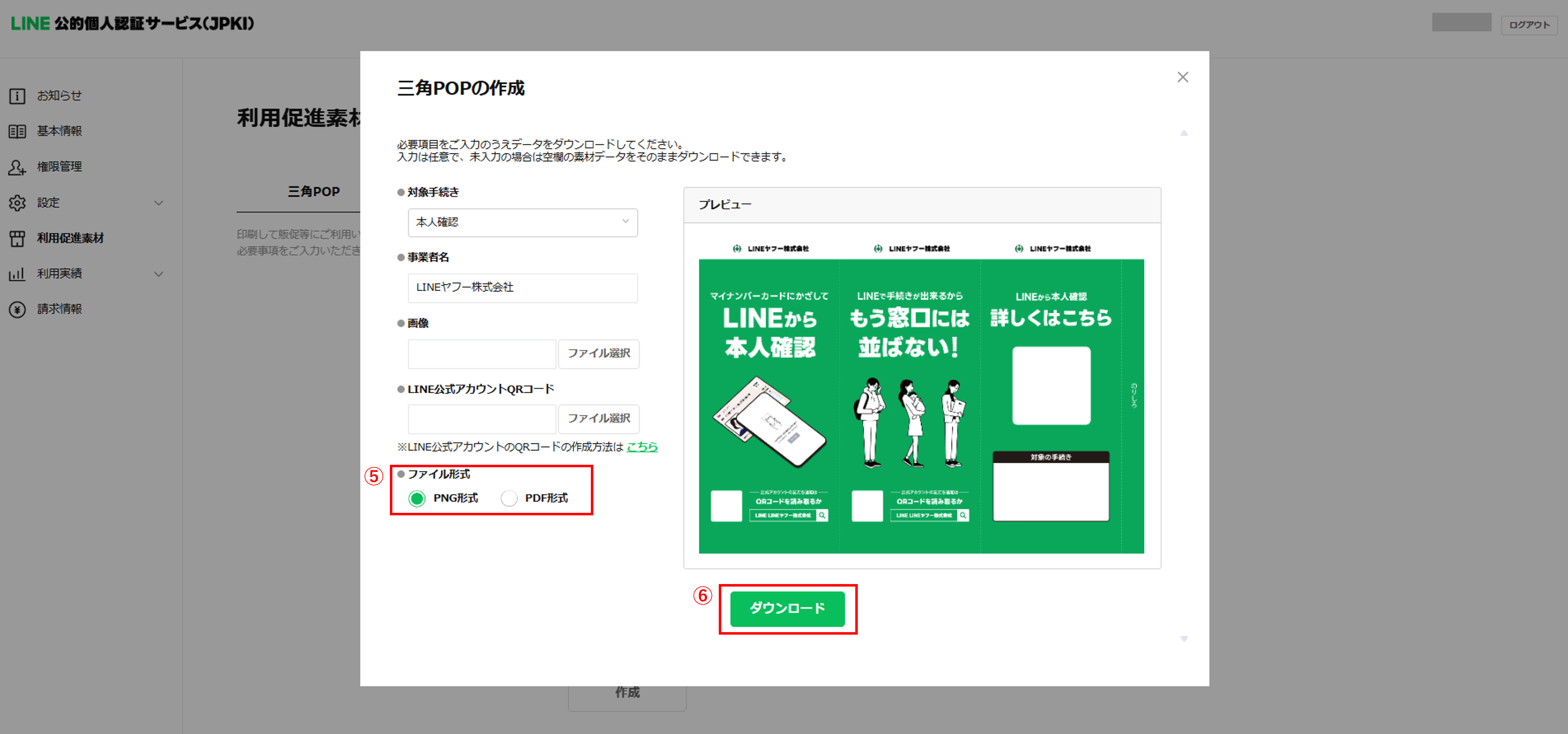 ⑥「ダウンロード」を押して作成した利用促進素材をダウンロード